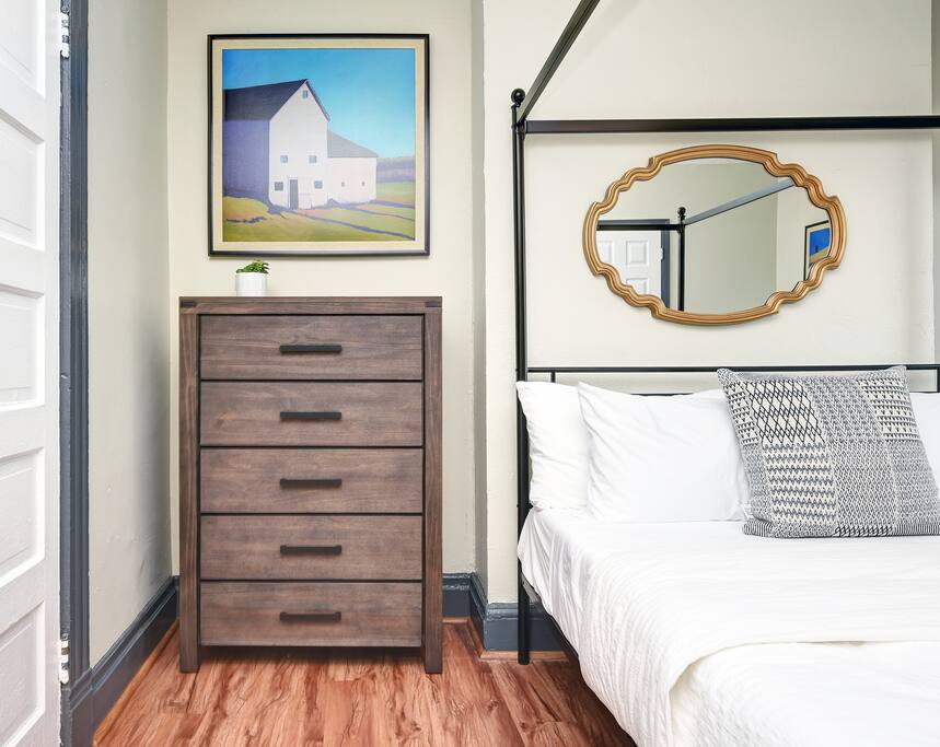 - Bedrooms include clothing storage such as shelving and clothes rod with hangers, luggage racks, clean linens/towels, and memory foam mattresses.
