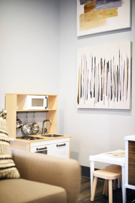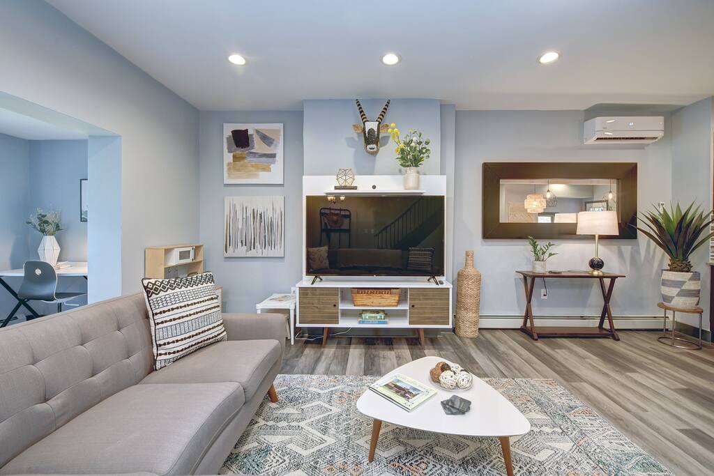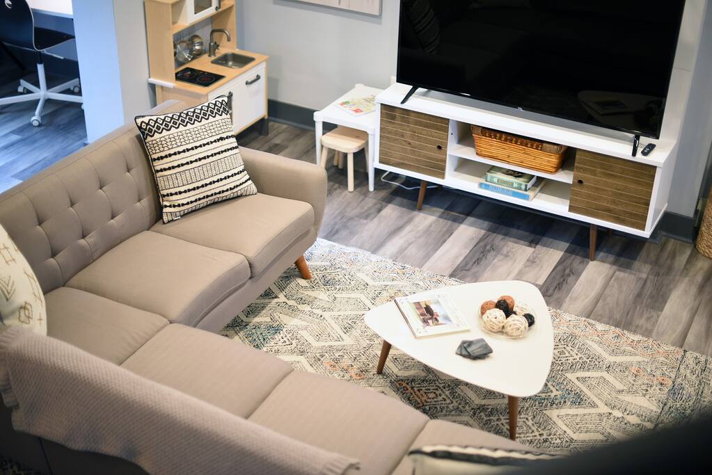 - Living Room with smart TV (yay Netflix!), AT&T TV (formally DirecTV Now), and sitting area.